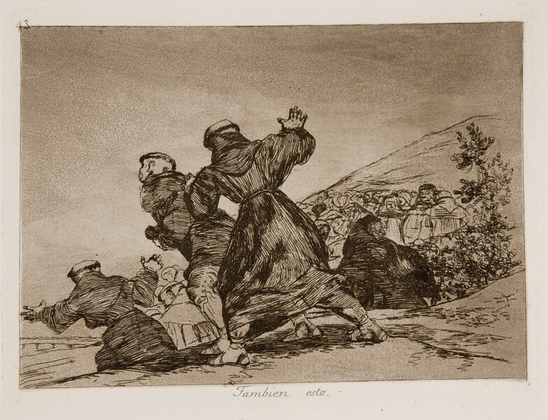 As in print no. 42, Everything is topsy-turvy (Todo va revuelto), Goya creates a scene showing the flight of clergymen who, following their absence from previous prints, now take on an important role in the series.